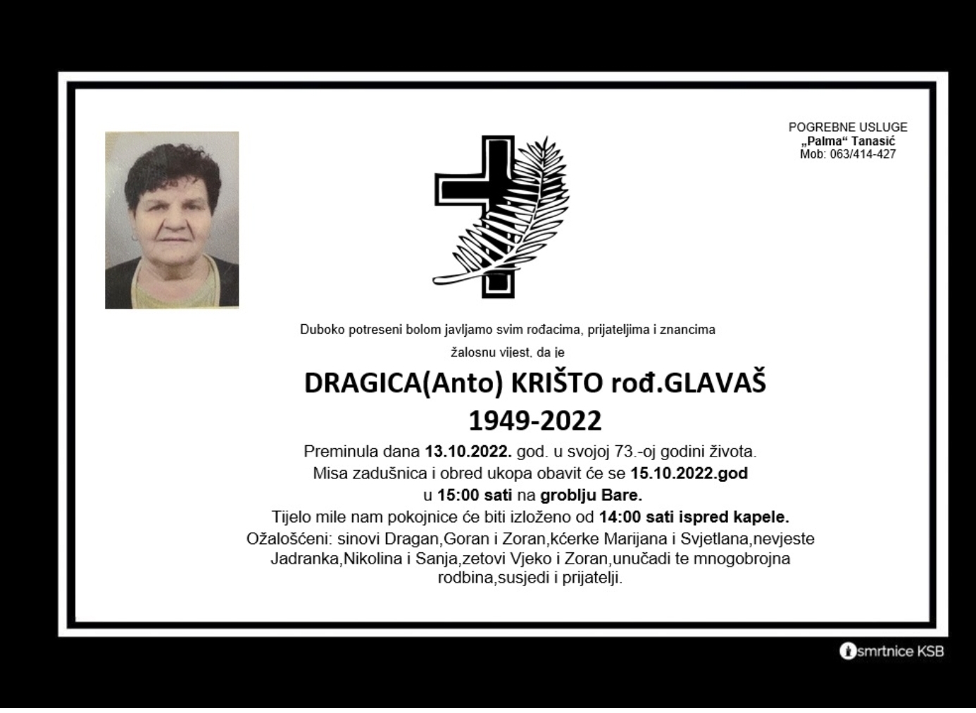 Duboko potreseni bolom javljamo svim rođacima, prijateljima i znancima žalosnu vijest, da je Dragica (Anto) Krišto rođ. Glavaš preminula dana 13. listopada 2022. godine u svojoj 73. godini života.