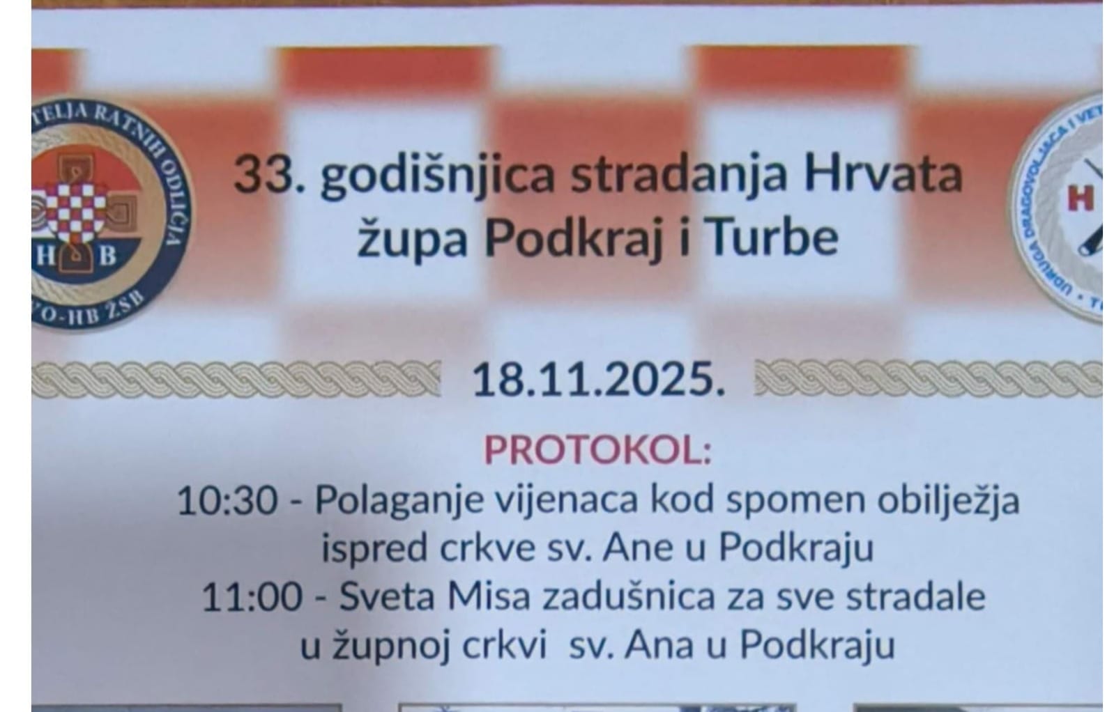 U Potkraju, 18. studenoga 2025., povodom 33. godišnjice progona i stradanja Hrvata župe Potkraj i Turbe, te na dan utemeljenja Hrvatske zajednice Herceg-Bosne, Udruga nositelja ratnih odlikovanja HVO-a Herceg Bosne Županije Središnja Bosna upućuje poziv svim braniteljima, obiteljima poginulih, vjernicima i građanima da se pridruže obilježavanju ovog važnog dana sjećanja.