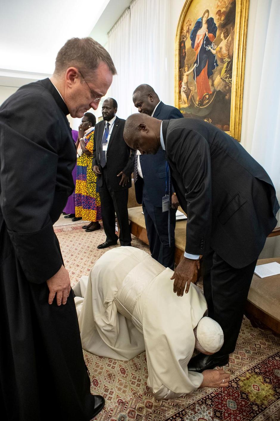 Papa Franjo je u četvrtak, u nezabilježenoj gesti, kleknuo i poljubio stopala vođama Južnog Sudana koji su prethodno međusobno ratovali te ih pozvao da se ne vraćaju građanskom ratu.
