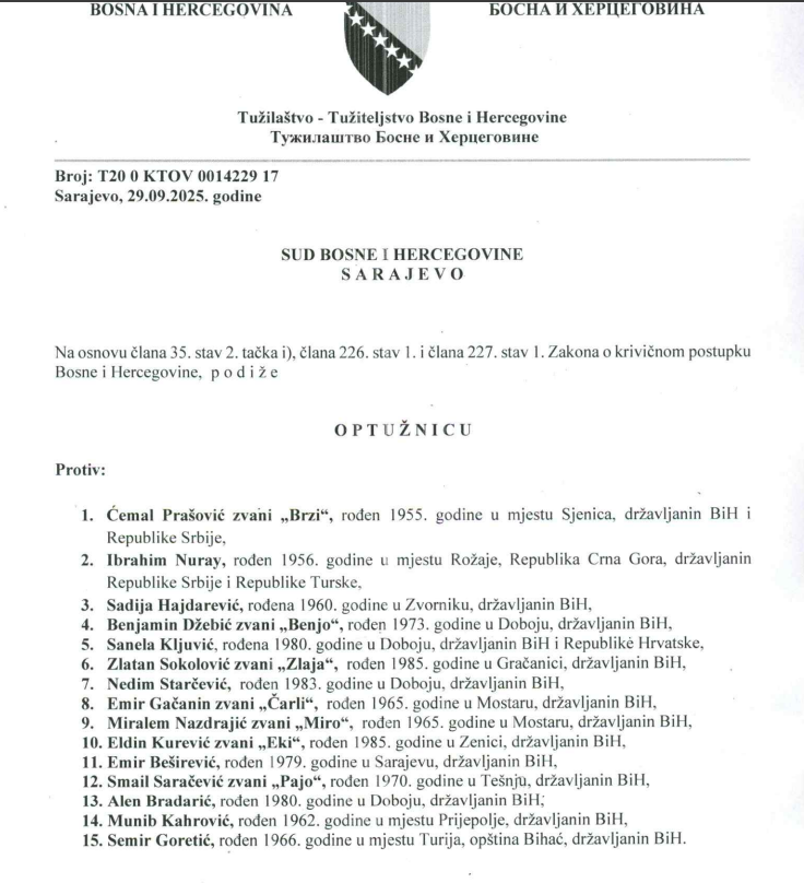 Među optuženima su Ćemal Prašović zv. „Brzi“, Ibrahim Nuray, Sadija Hajdarević, Benjamin Džebić zv. „Benjo“, Sanela Kljuvić, Zlatan Sokolović, Nedim Starčević, Emir Gačanin zv. „Čarli“, Miralem Nazdrajić, Eldin Kurević zv. „Eki“, Emir Beširević, Smail Saračević zv. „Pajo“, Alen Bradarić, Munib Kahrović i Semir Goretić.