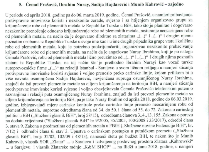 Prema navodima optužnice, Ćemal Prašović je bio organizator grupe koja je dogovarala nabavu i krijumčarenje zlata i srebra iz Republike Turske. Robu su prevozili preko granice bez carinske prijave, najčešće putem vozača Nuray Ibrahima, zaposlenog u turskoj prijevozničkoj tvrtki na relaciji Istanbul – Sarajevo.