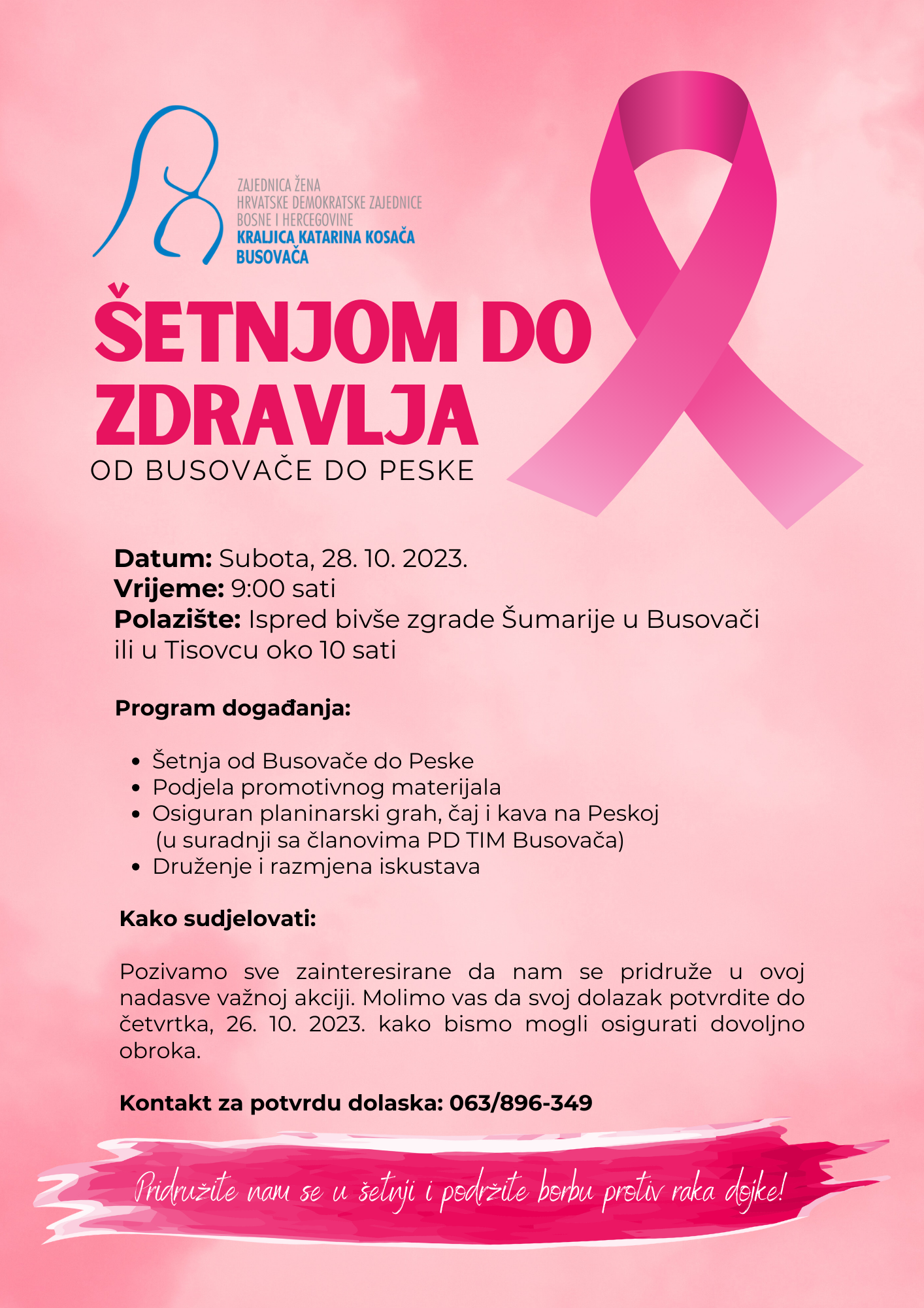U povodu obilježavanja mjeseca ružičaste vrpce, u subotu 28. listopada 2023. godine, u organizaciji OO ZŽ HDZ BiH KKK Busovača planirana je aktivnost “Šetnjom do zdravlja”.