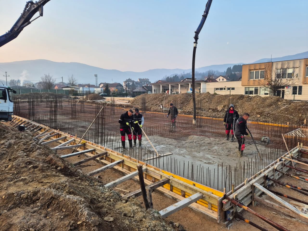 Radovi na izgradnji napreduju planiranom dinamikom, a danas je u tijeku važna faza – ulijevanje betonske ploče, koja predstavlja temelj za nastavak izgradnje objekta.