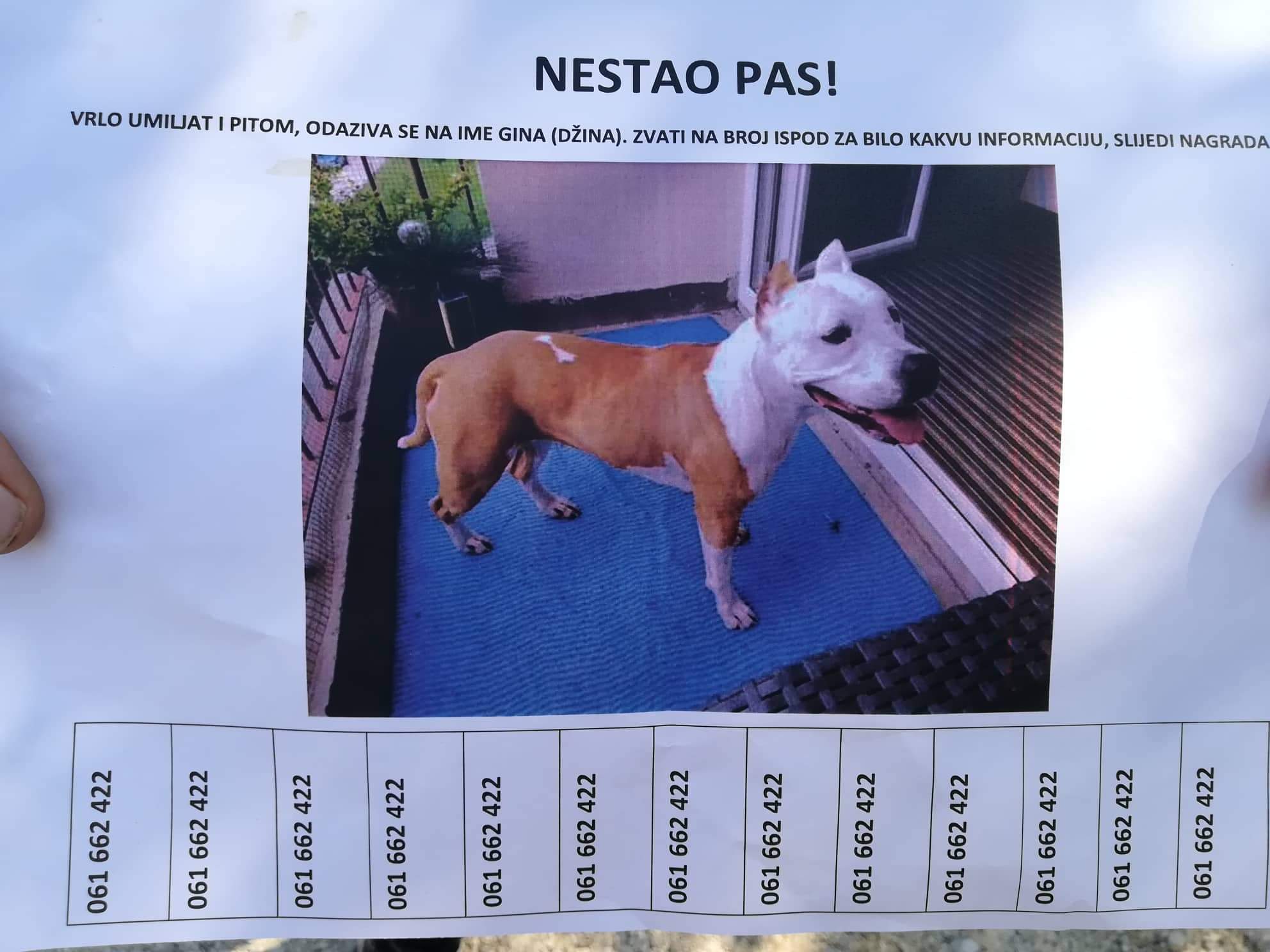Pas je vrlo umiljat i pitom, odaziva se na ime Gina. Za svaku informaciju možete pozvati na broj mobitela: 061 662 422