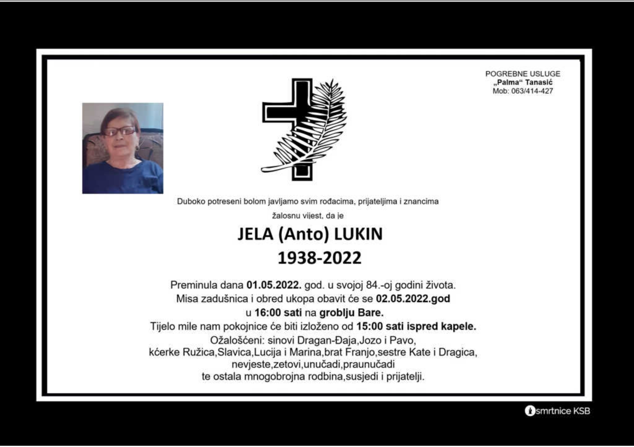 Duboko potreseni bolom javljamo svim rođacima, prijateljima i znancima žalosnu vijest da je Jela (Anto) Lukin preminula dana 1. svibnja 2022. godine u svojoj 84. godini života.