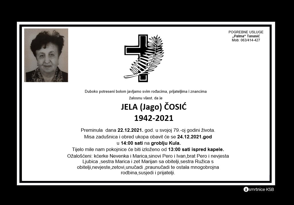 22. prosinca 2021. u svojoj 79 godini života preminula je Jela Čosić. Misa zadušnica i obred ukopa obavit će se 24.12.2021. u 14:00 sati na groblju Kula.