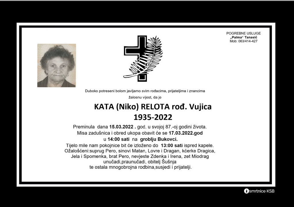 Duboko potreseni bolom javljamo svim rođacima, prijateljima i znancima žalostnu vijest, da je Kata (Niko) Relota rođena Vujica (1935-2022) preminula dana 15. ožujka 2022. godine u svoojoj 87. godini života.