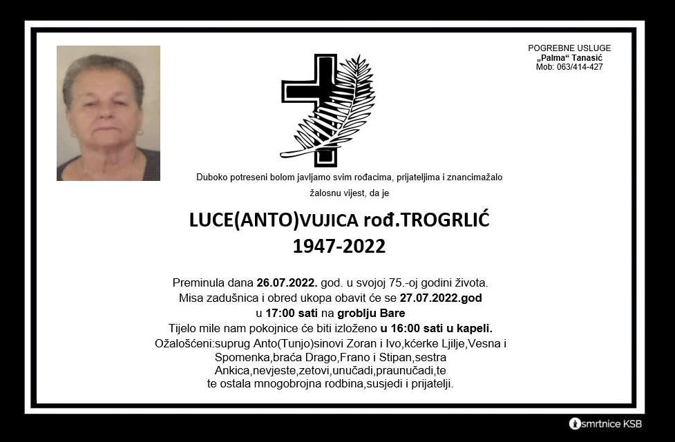 26. srpnja u svojoj 75. godini života preminula je Luce Vujica rođena Trogrlić. Misa zadušnica i obred ukopa obavit će se dana 27. srpnja u 17:00 sati na groblju Bare.