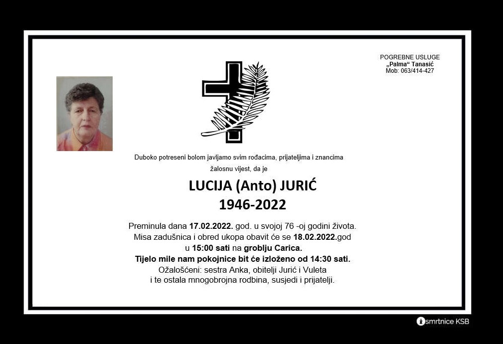 Lucija Jurić, preminula je dana 17. veljače 2022. godine u svojoj 76. godini života. Misa zadušnica i obred ukopa obavit će se dana 18. veljače 2022. godine u 15:00 sati na groblju Carica.