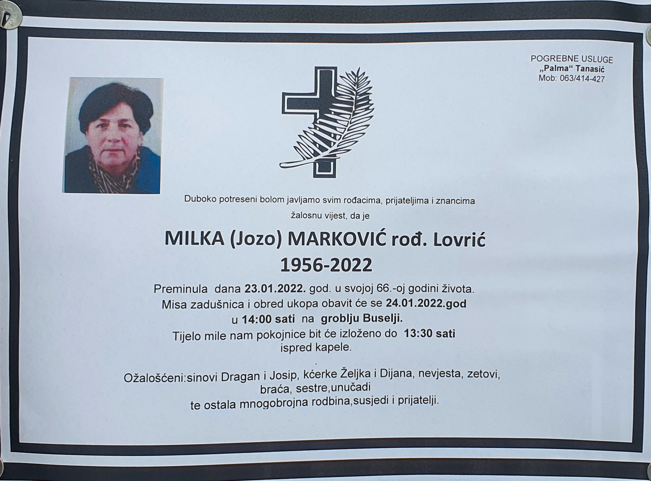 Milka (Jozo) Marković preminula je dana 23. siječnja 2022. godine u svojoj 66. godini života.
