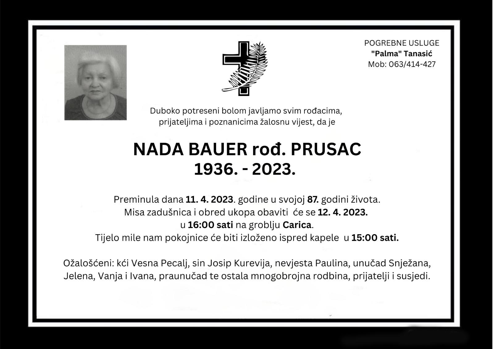 Duboko potreseni bolom javljamo svim rođacima, prijateljima i poznanicima žalosnu vijest, da je Nada Bauer rođ. Prusac preminula dana 11. travnja 2023. godine u svojoj 87. godini života.