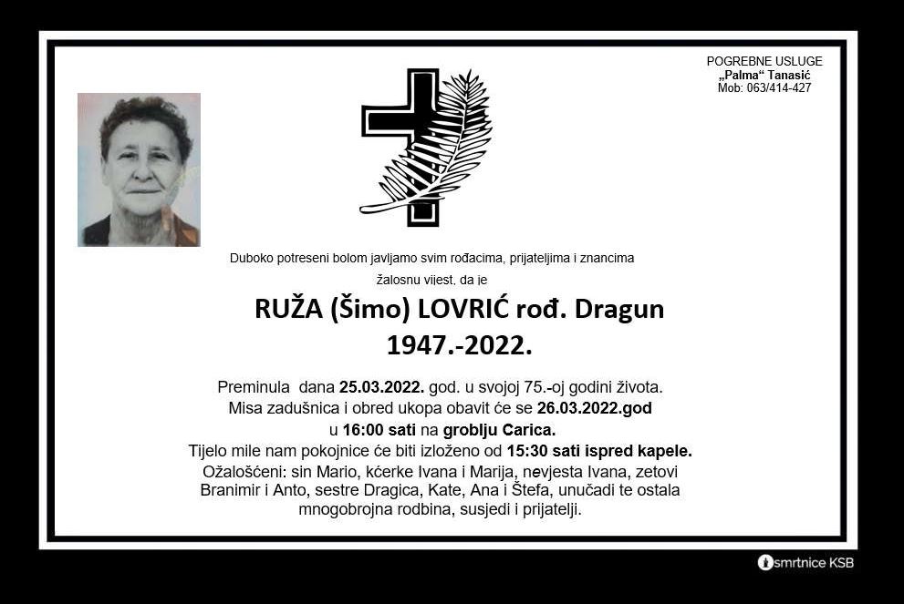 25. ožujka 2022. u svojoj 75-oj godini života preminula je Ruža Lovrić. Misa zadušnica i obred ukopa obavit će se 26. ožujka u 16:00 sati na groblju Carica.