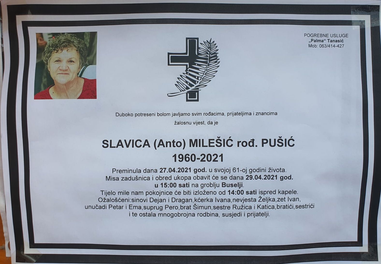 Slavica (Anto) Milešić rođ. Pušić preminula je dana 27. travnja 2021. godine u svojoj 61-oj godini života.