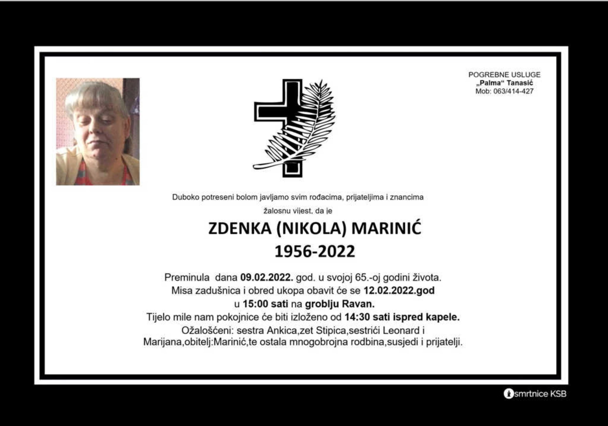 Duboko potreseni bolom javljamo svim rođacima, prijateljima i znancima žalosnu vijest, da je Zdenka (Nikola) Marinić preminula dana 9. veljače 2022. godine u svojoj 65. godini života.
