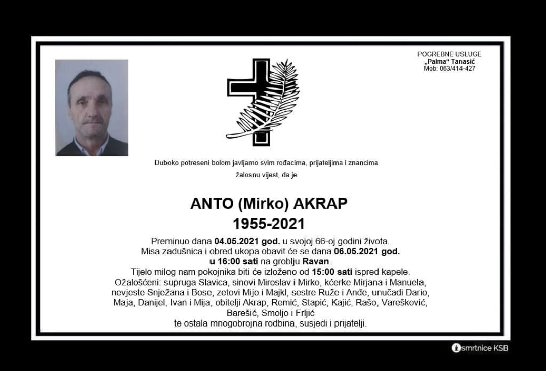 Anto je preminuo u svojoj 66. godini života. Misa zadušnica i obred ukopa obavit će se 6. svibnja 2021. u 16:00 sati na groblju Ravan.