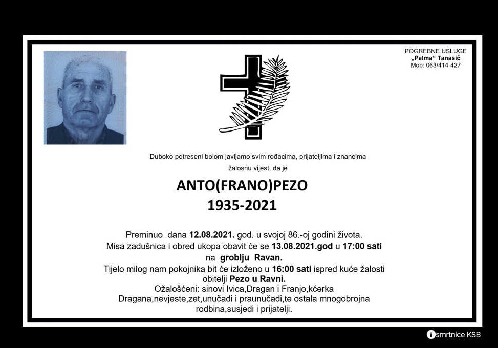 Anto (Frano) Pezo preminuo je 12. kolovoza 2021. godine u svojoj 86. godini života.