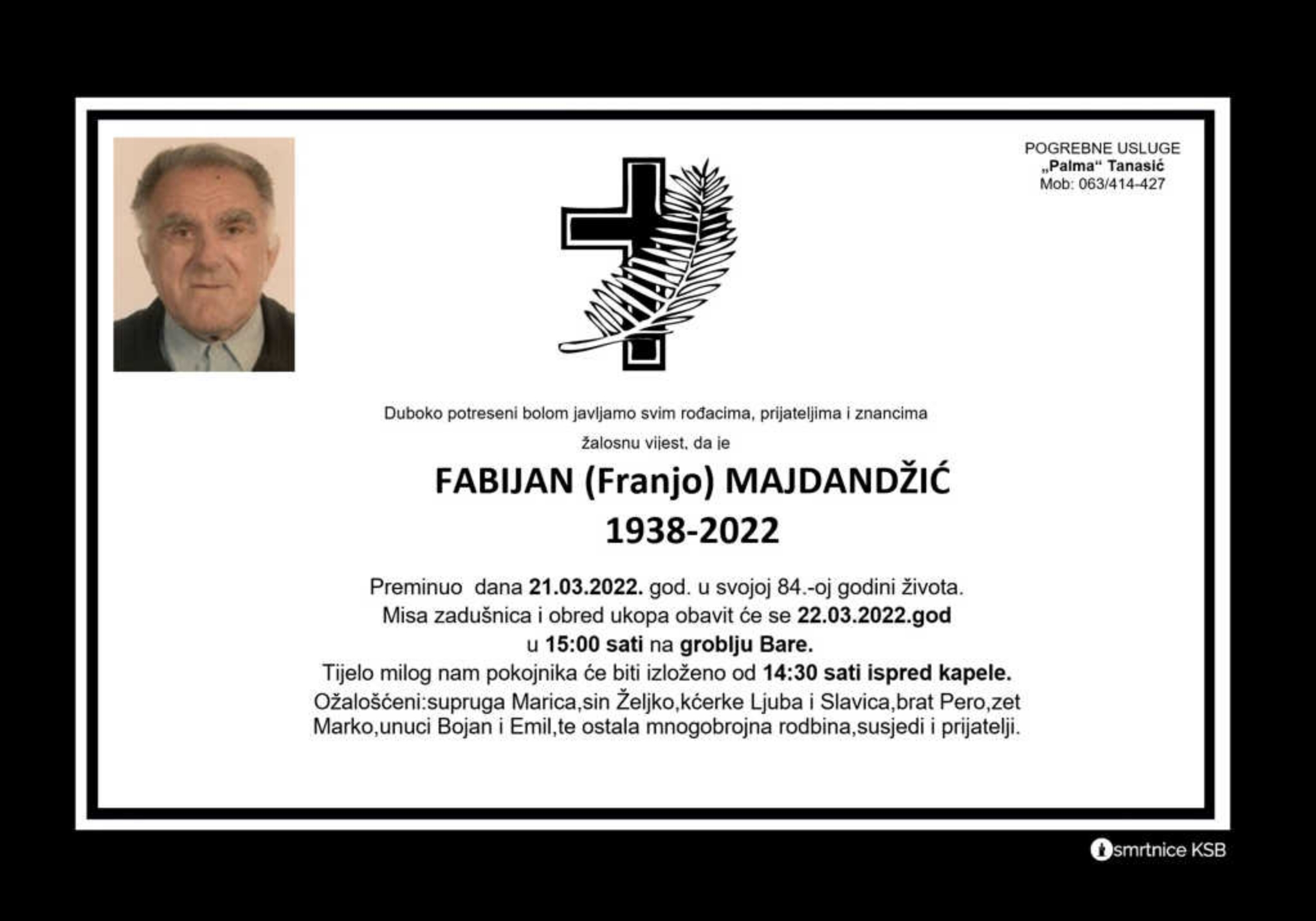 Duboko potreseni bolom javljamo svim rođacima, prijateljima i znancima žalosnu vijest, da je Fabijan (Franjo) Majdandžić preminuo dana 21. ožujka 2022. godine u svojoj 84. godini života.
