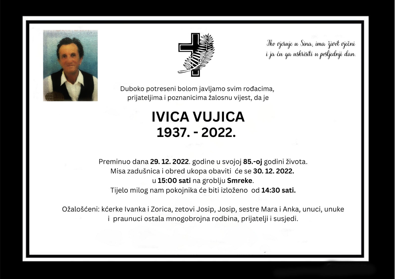 Obred ukopa i misa zadušnica obavit će se 30.12. u 15:00 sati na groblju Smreke.