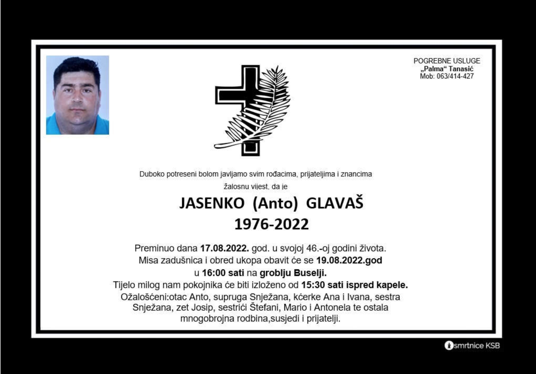 Duboko potreseni bolom javljamo svim rođacima, prijateljima i znancima žalosnu vijest, da je Jasenko (Anto) Glavaš preminuo dana 17. kolovoza 2022. godine u svojoj 46. godini života.