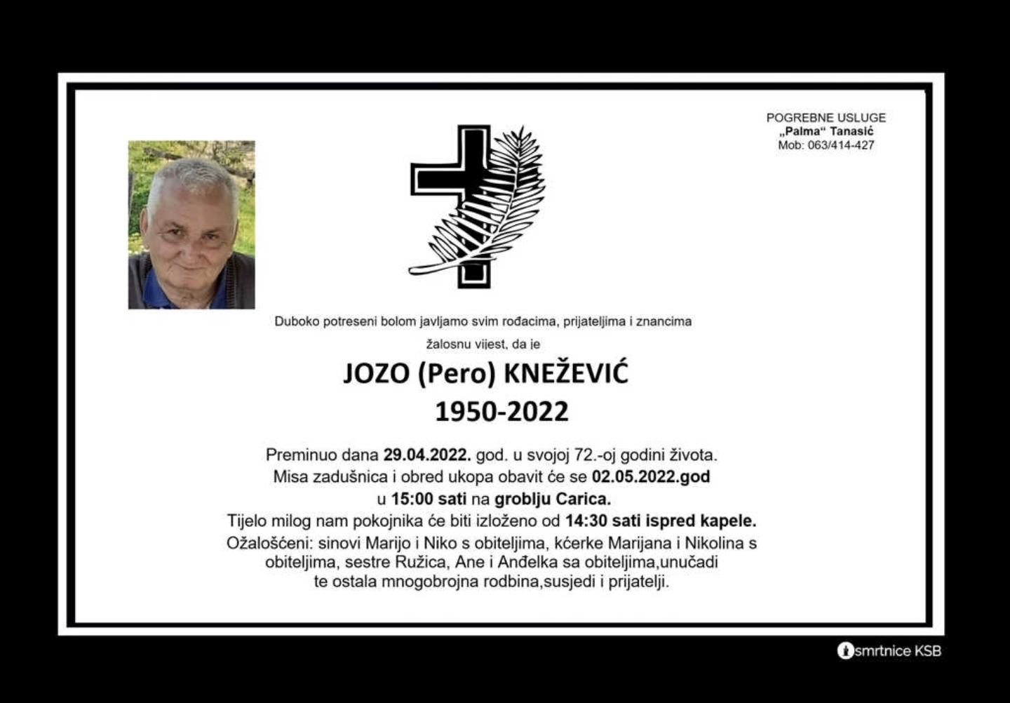 Duboko potreseni bolom javljamo svim rođacima, prijateljima i znancima žalosnu vijest da je Jozo (Pero) Knežević preminuo dana 29. travnja 2022. godine u svojoj 72. godini života.