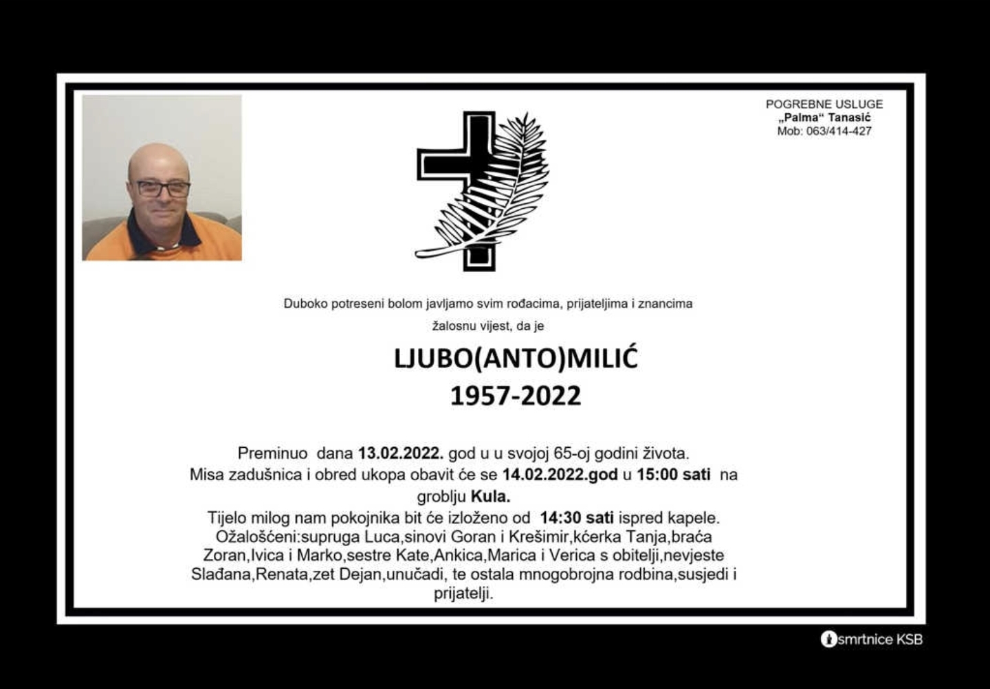 Duboko potreseni bolom javljamo svim rođacima, prijateljima i znancima žalosnu vijest, da je Ljubo (Anto) Milić preminuo dana 13. veljače 2022. godine u svojoj 65. godini života. Misa zadušnica i obred ukopa obavit će se dana 14. veljače 2022. godine u 15 sati na groblju Kula.