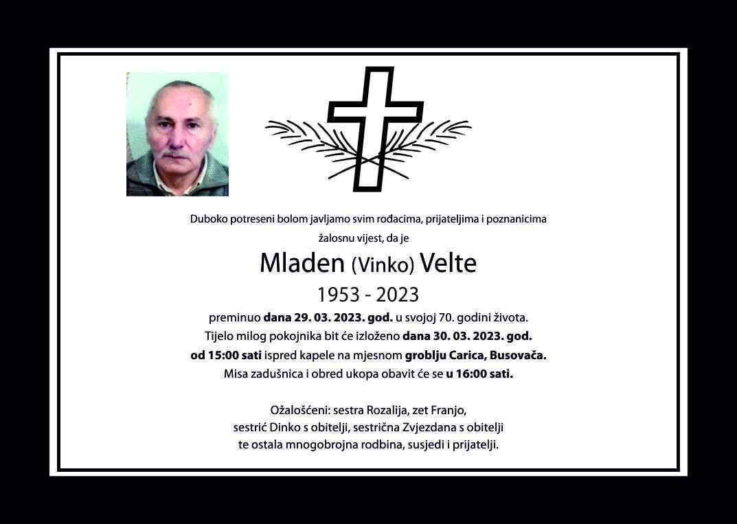 Duboko potreseni bolom javljamo svim rođacima, prijateljima i poznanicima žalosnu vijest, da je Mladen (Vinko) Velte preminuo dana 29. ožujka 2023. godine u 70. godini života.