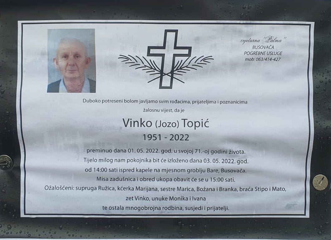 Tijelo milog nam pokojnika bit će izloženo dana 3. svibnja 2022. godine od 14 sati ispred kapela na mjesnom groblju Bare, Busovača. Misa zadušnica i obred ukopa obavit će se u 15 sati.