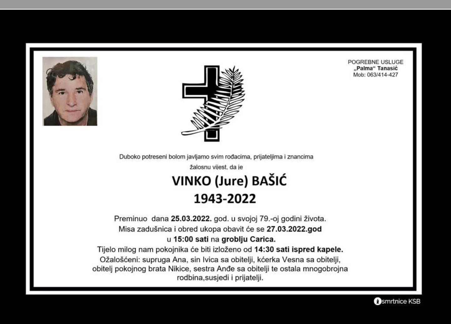 Duboko potreseni bolom javljamo svim rođacima, prijateljima i znancima žalosnu vijest, da je Vinko (Jure) Bašić preminuo dana 25. ožujka 2022. godine u svojoj 79. godini života.