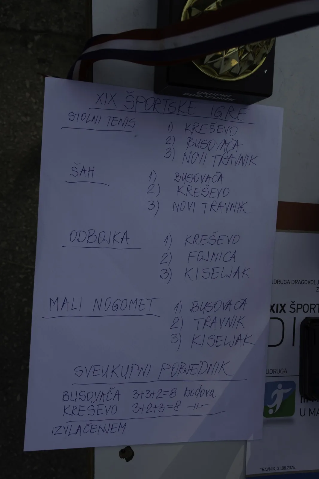 Sveukupni poredak rezultirao je izjednačenjem bodova između Busovače i Kreševa, no Busovača je izvlačenjem proglašena ukupnim pobjednikom XIX. Sportskih igara. Ovim rezultatom Busovača je još jednom pokazala svoju snagu i zajedništvo, istaknuvši se među brojnim ekipama koje su sudjelovale na ovom događaju.