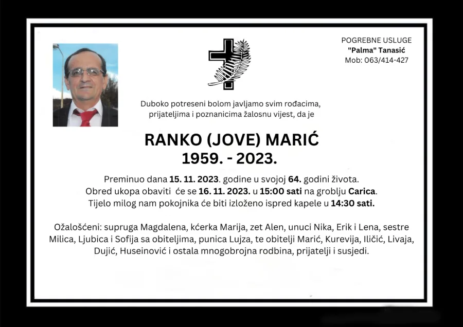Obred ukopa obaviti će se 16. 11. 2023. u 15:00 sati na groblju Carica. Tijelo milog nam pokojnika će biti izloženo ispred kapele u 14:30 sati.