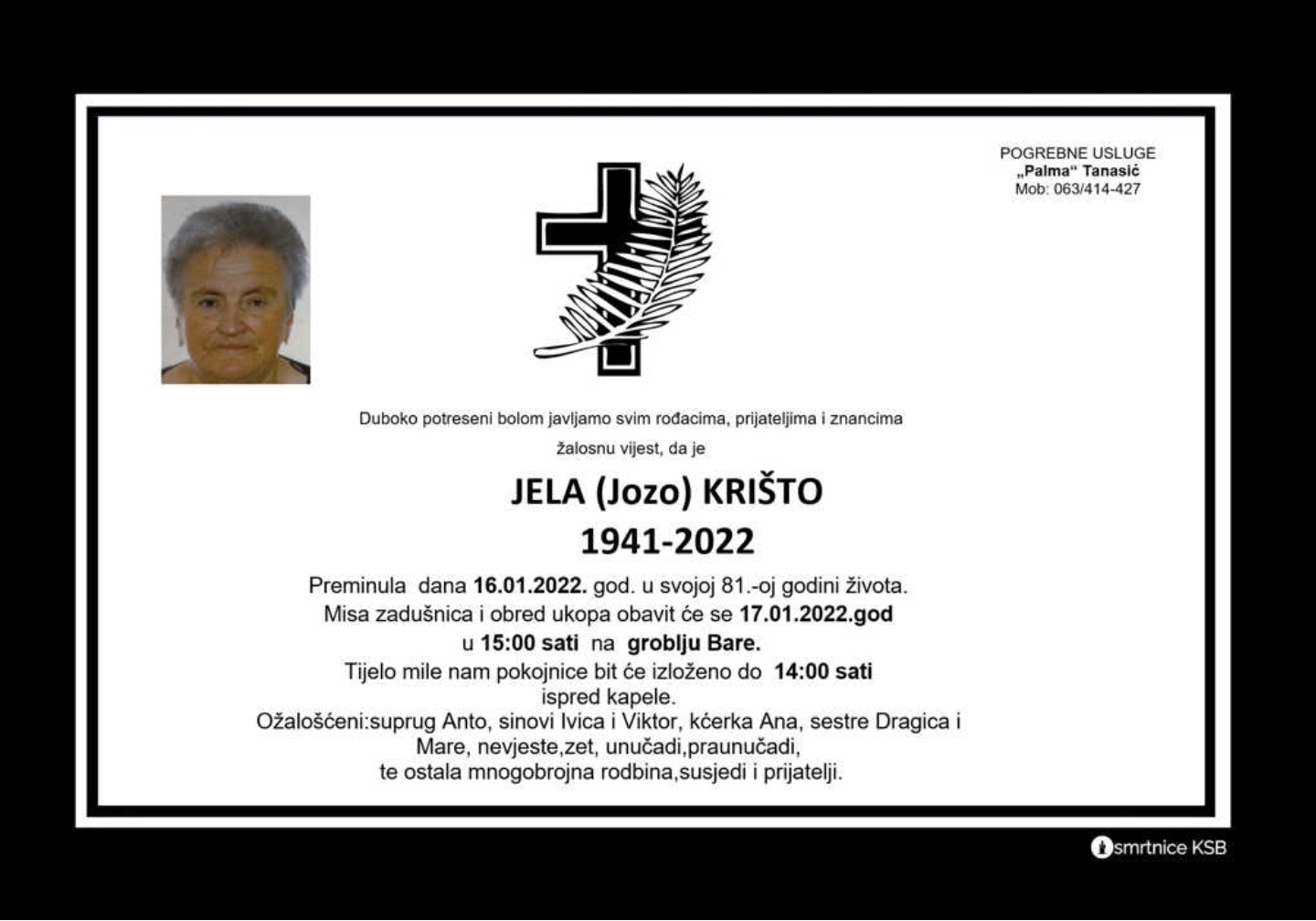 Misa zadušnica i obred ukopa obavit će se dana 17. siječnja 2022. godine u 15 sati na groblju Bare u Busovači.
