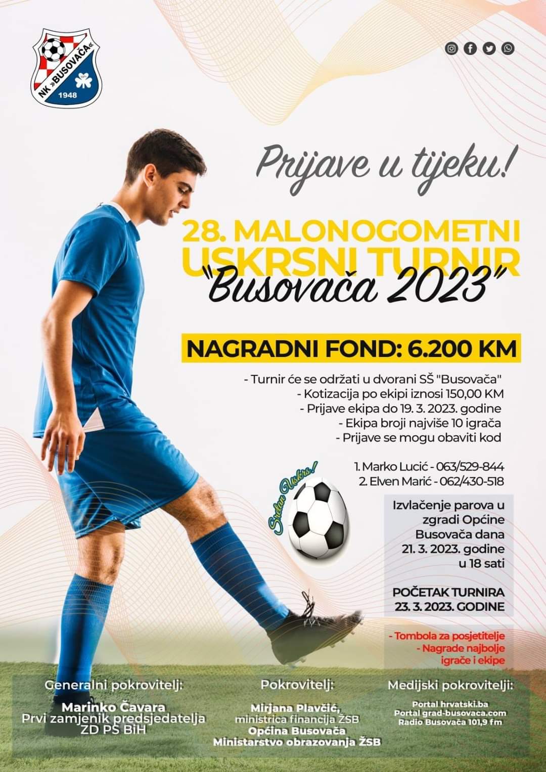 U Busovači uskoro počinje Uskrsni turnir u malom nogometu. Svoje ekipe možete prijaviti do 20. ožujka kada je i izvlačenje u sali zgrade Općine Busovača. Izvlačenje počinje u 17:30 sati.