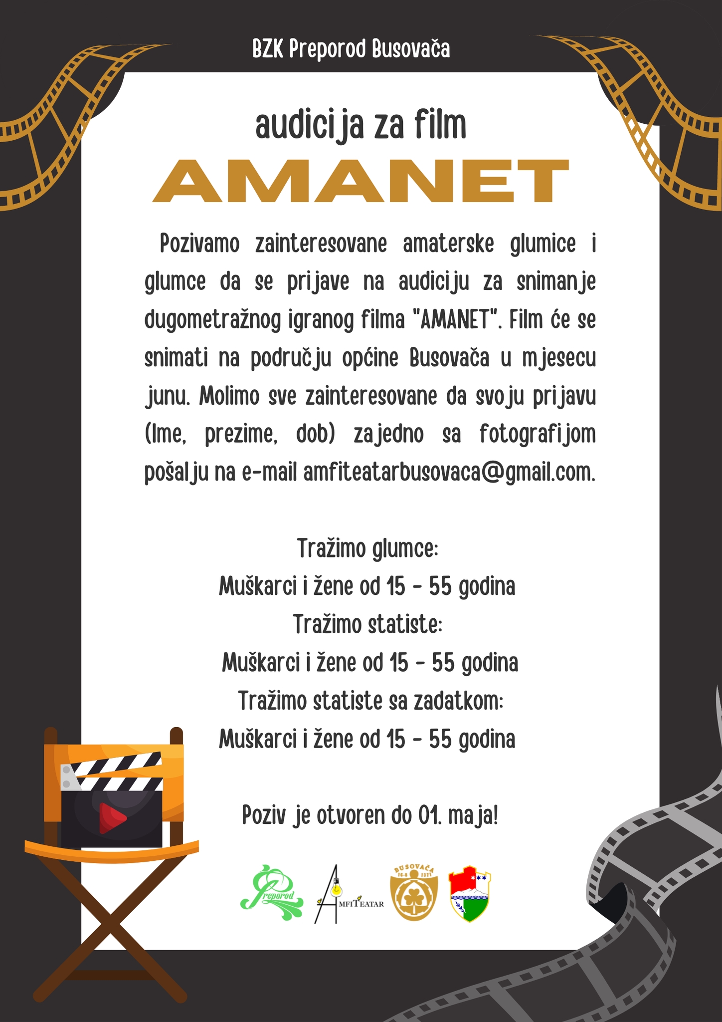 BZK “Preporod” Busovača poziva sve zainteresirane amaterske glumice i glumice da se prijave na audiciju/casting za igrani film “Amanet” koji će se u mjesecu junu/lipnju snimati na području općine Busovača.