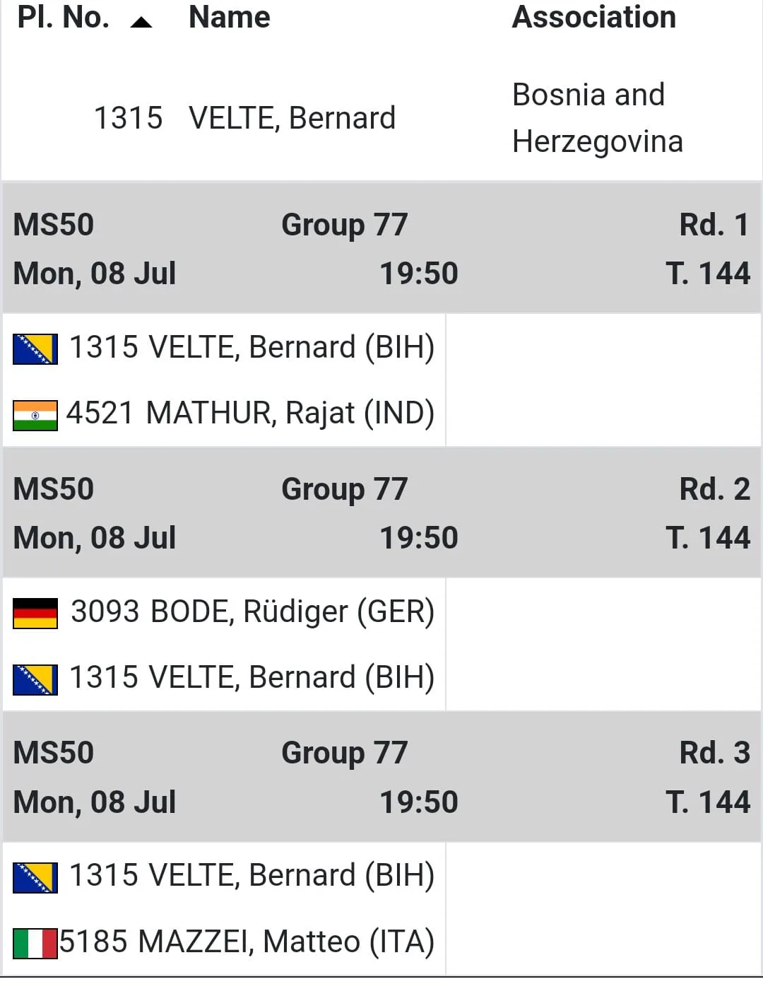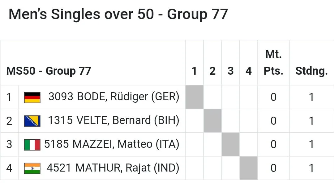 Bernard Velte će se natjecati u kategoriji od 50 do 54 godine, jednoj od mnogih koje obuhvaćaju dobne skupine od 40 do 95 godina. “77. sam grupa od 167 grupa u mojoj kategoriji. Tijekom prvih susreta igrat ću protiv Njemca, Italijana te Indijca. Nakon grupne faze, ovisno o rezultatu, nastupam u turnirskom dijelu u grupi A ili B“, izjavio je Bernard Velte za sredisnjabosna.ba portal.