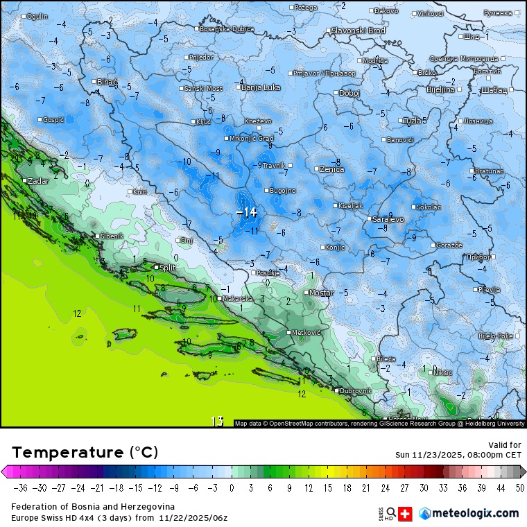 Temperatura u nedjelju navečer između -8 i -2, na planinama lokalno do -14 °C.