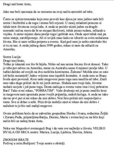 Ožalošćeni: Sestre Marica, Lucija, Ljubica, Slavica i Jelena s obitelji, te ostala rodbina i prijatelji.