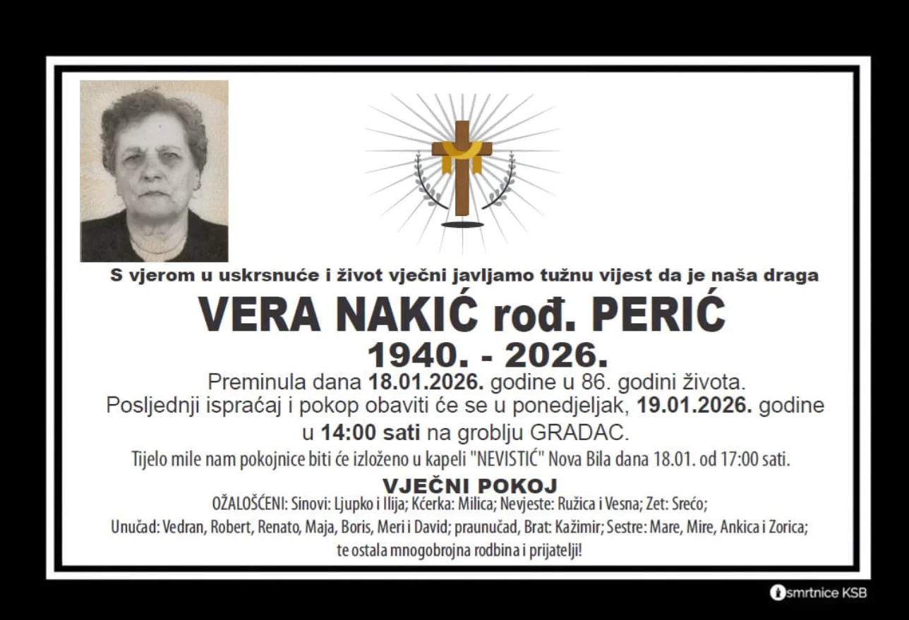 Vera Nakić preminula je 18. siječnja 2026. godine u 86. godini života. Posljednji ispraćaj i pokop bit će upriličeni danas, u ponedjeljak, 19. siječnja 2026. godine, s početkom u 14 sati.