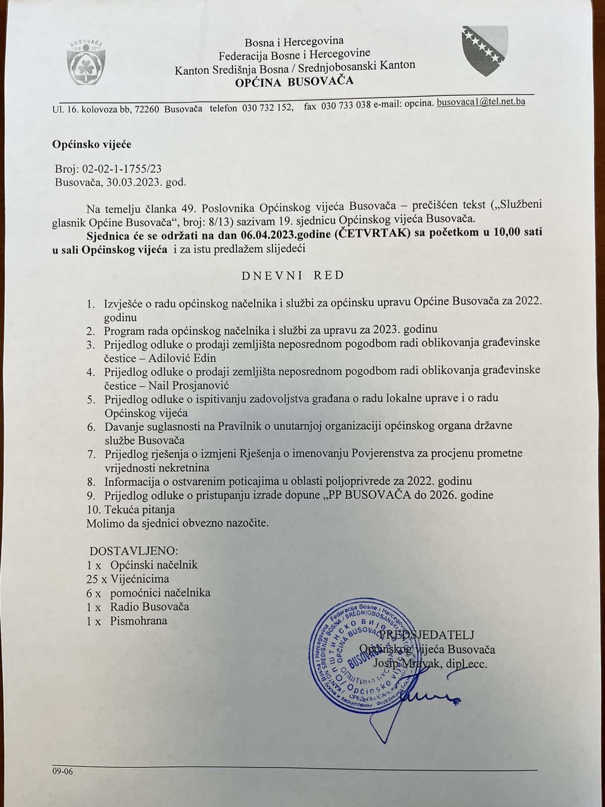 Predsjedatelj Općinskog vijeća Busovača Josip Mravak za danas je sazvao 19. redovitu sjednicu Općinskog vijeća Busovača.
