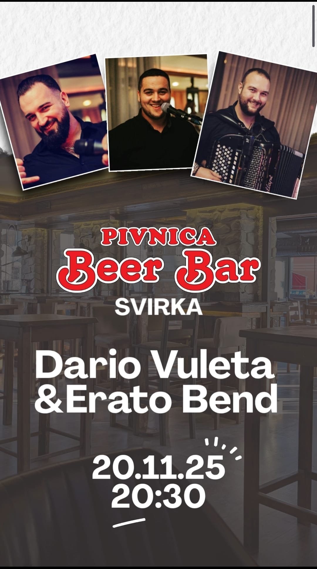 Busovaču uskoro očekuje nova doza vrhunske zabave – Dario Vuleta i Erato bend nastupit će u četvrtak, 20. studenoga 2025. godine s početkom u 20:30 sati u Pivnici Beer Bar.