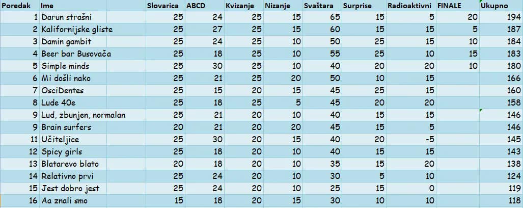 Ukupno 60 igrača iz 16 ekipa je nastupilo i doprinijele stvaranju pozitivne kvizaške atmosfere.Vidimo se opet u četvrtak od 19:30