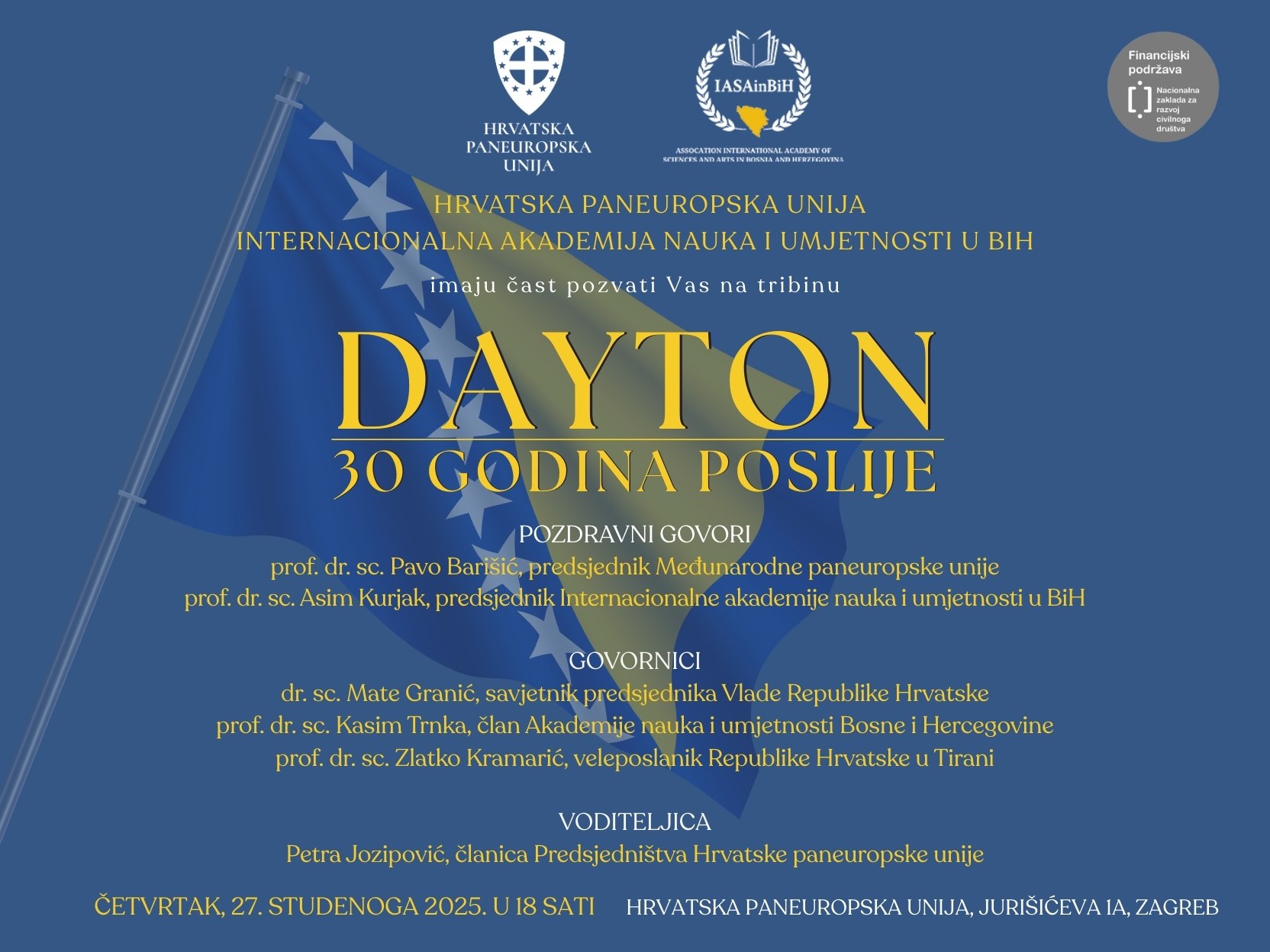 U četvrtak, 27. studenoga 2025. godine, s početkom u 18:00 sati, u sjedištu Hrvatske paneuropske unije u Zagrebu (Jurišićeva 1A) održat će se tribina pod nazivom „Dayton – 30 godina poslije“.