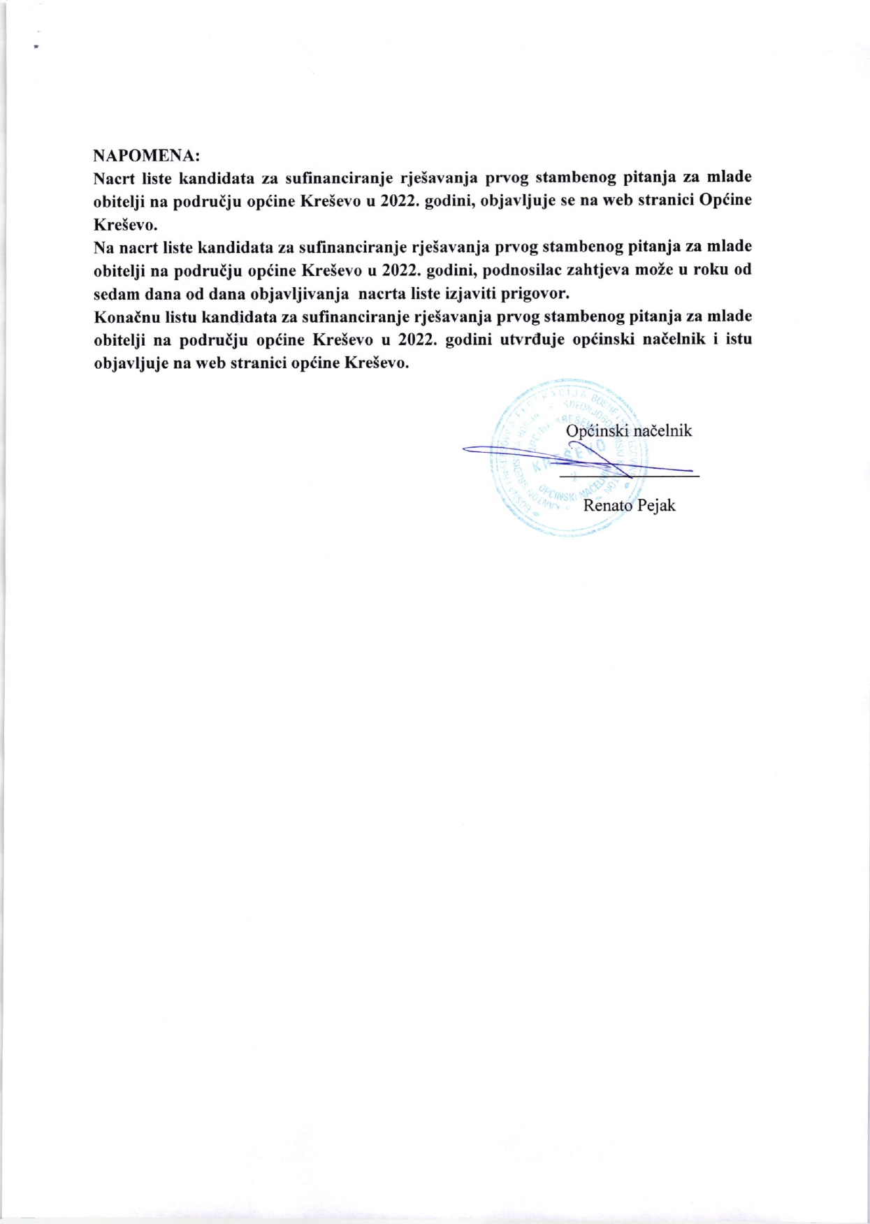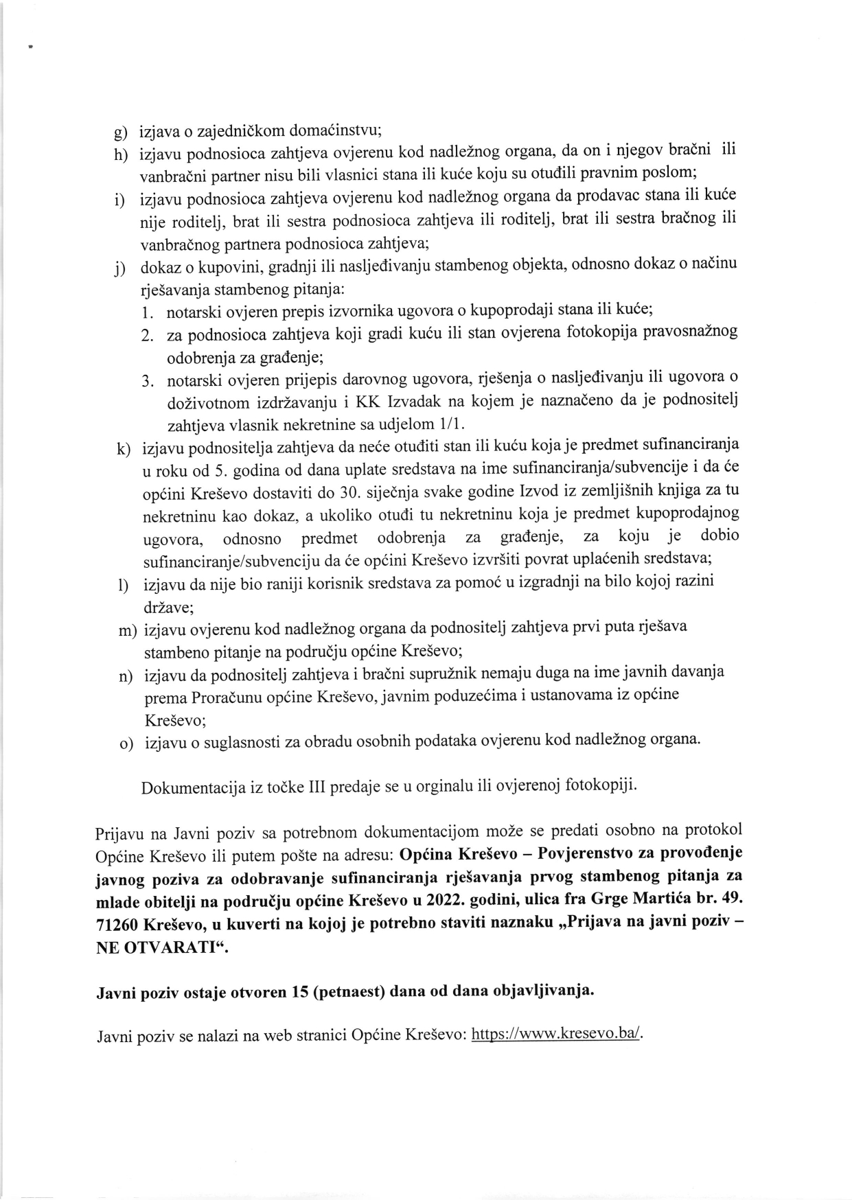 Javni poziv za sufinanciranje rješavanja prvog stambenog pitanja za mlade obitelji raspisala je Općina Kreševo dana 11. srpnja 2022. godine. Javni poziv pročitajte u nastavku.