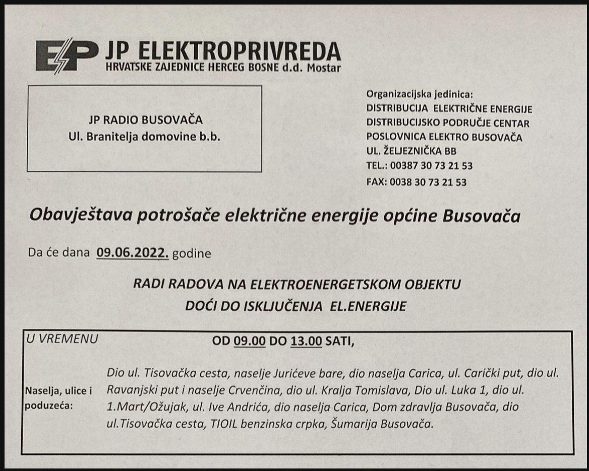 Elektropeivreda HZ HB d.d. – poslovnica Elektro Busovača za danas ne najavila nestanak električne energije u pojedinim dijelovima Busovače.