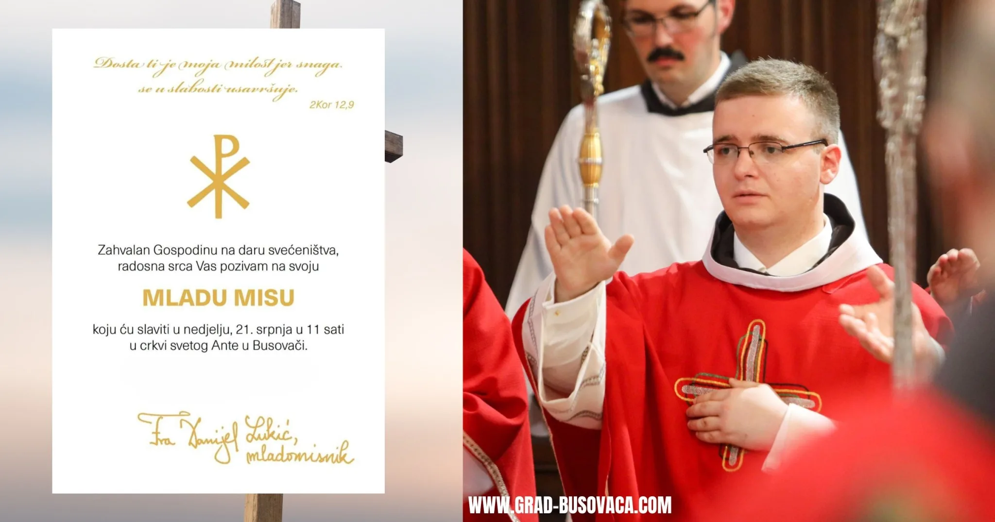 “U zahvalnosti Bogu na daru svećeničkog i redovničkog poziva, pozivam vas na proslavu moje mlade mise koju ću slaviti u nedjelju u našoj župnoj crkvi sv. Ante Padovanskog u 11 sati.