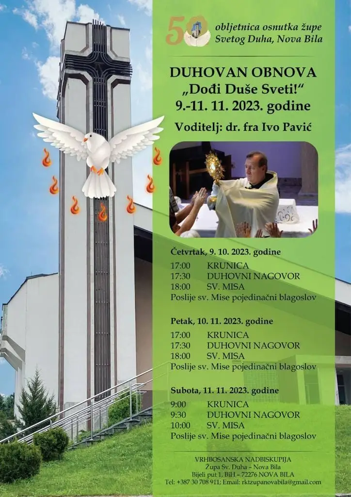 Povodom 50. obljetnice osnutka župe Svetoga duha u Novoj Biloj bit će upriličena duhovna obnova. Duhovna obnova trajat će kroz tri dana mjeseca studenoga (9. – 11.11.2023.), a predvodit će je dr. fra Ivo Pavić.