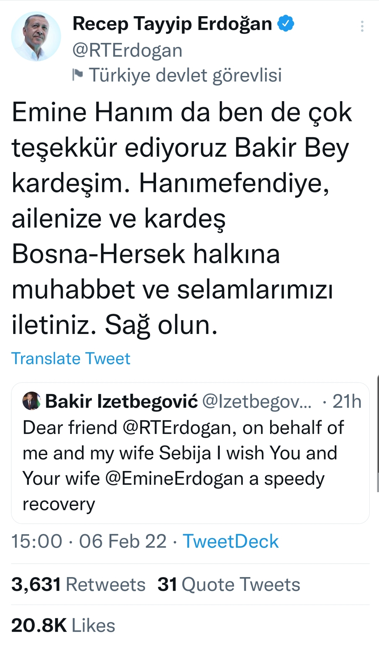 “Emine i ja zahvaljujemo ti, Bakire, brate moj. Molim te prenesi našu ljubav i pozdrave gospođi, vašoj obitelji i bratskom narodu Bosne i Hercegovine. Hvala ti”, odgovorio mu je Erdogan.