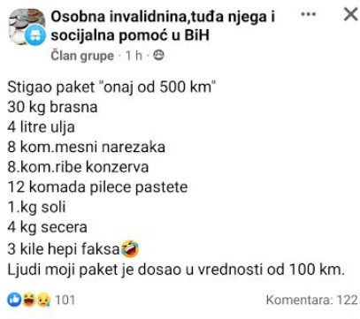 I kada smo možda i povjerovali kako će ovaj proces biti zaista od velike pomoći ugroženim obiteljima, dobili smo preslik objave u jednoj facebook grupi gdje je jedan od članova objavio što se nalazi u paketu od 500 KM.
