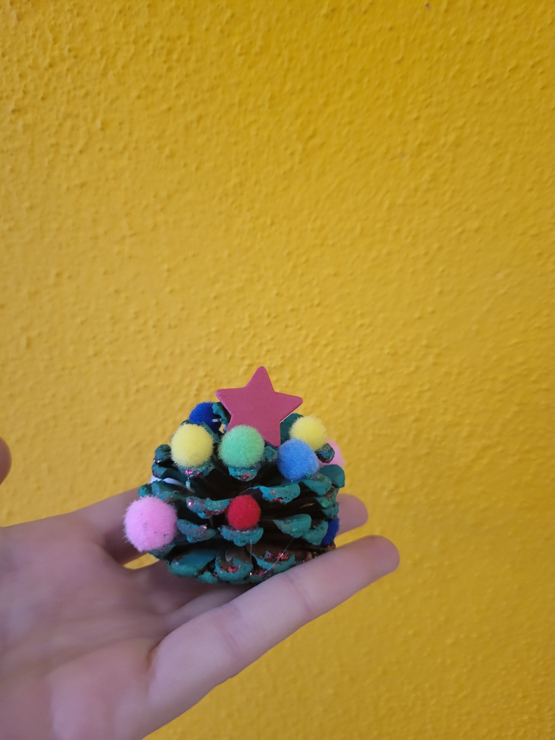 Zatim smo prešli na naše aktivnosti i izradu dekoracija. Svatko je imao zadatak obojiti svoju šišarku (češer) u zelenu boju kao jelku, a nakon sušenja tempere ukrasili smo naše jelkice šarenim pompon kuglicama i zvijezdom na vrhu. Kao još jedan ukras, napravili smo zvijezde od kartona, koje smo bojili, lijepili i kačili vrpce kako bismo naše ukrase mogli okačiti u svom domu. ⭐️