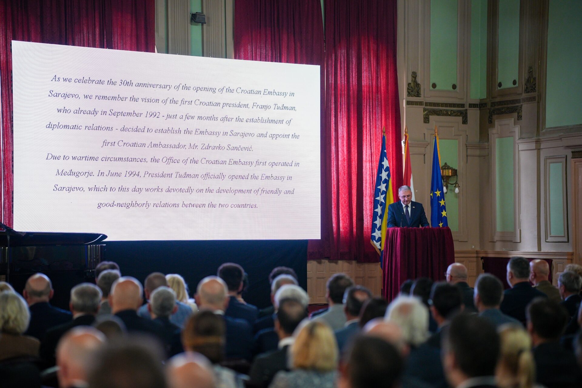 Događaju su nazočili dužnosnici HDZ-a BIH predvođeni predsjednicom Federacije BiH, Lidijom Bradara. Uz predsjednicu Bradara, na koncertu je bio i zamjenik predsjedatelja Zastupničkog doma PS BiH Marinko Čavara, izaslanica u Domu naroda PS BiH Marina Pendeš, federalni ministar pravde Vedran Škobić, predsjednik Vlade Županije Posavske Đuro Topić, predsjednica Vlade HNŽ-a Marija Buhač, izaslanik predsjedateljice Vijeća ministara Mate Lončar, kao i brojni drugi uvaženi gosti. Svečani govor održao je veleposlanik RH u BiH, Ivan Sabolić. Veleposlanstvo RH u Sarajevu službeno je otvorio dr. Franjo Tuđman, prvi predsjednik RH 14. lipnja 1994. godine, u nazočnosti dr. Zdravka Sančevića, prvog hrvatskog veleposlanika i prvog doajena diplomatskog zbora u BiH (1992-1995).