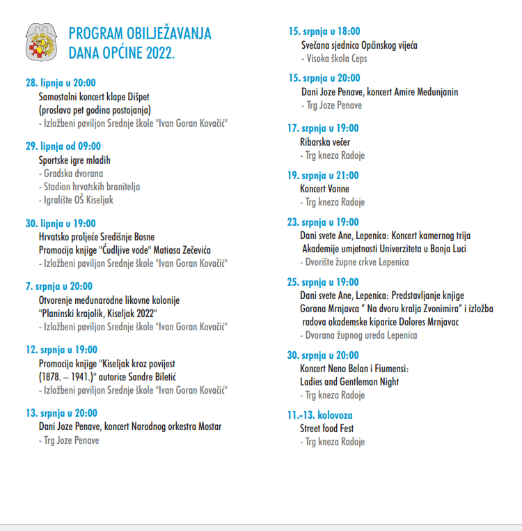 Mjesec srpanj ove godine je iznimno bogat sadržajima u povodu obilježavanja Dana općine Kiseljak. Općina Kiseljak uz pokroviteljstvo s udrugama donosi brojne zabavne, kulturne i sportske sadržaje.